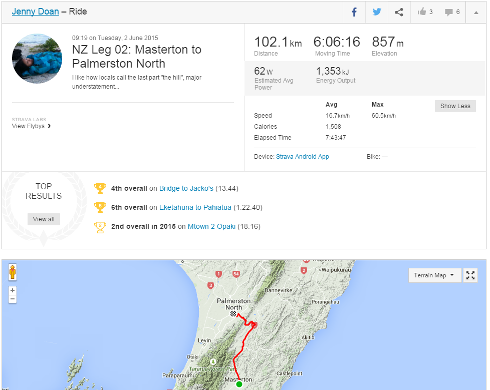 With 19km to go, I felt myself slowly reaching the wall, that point when your mind and body feel like lying down and staying down. So I told myself I would be allowed to have a break at the next convenient place. Then I saw the hill… It’s a bit hard to see and I think my hands were shaking at the time, so it looks pretty crummy. But that’s about a quarter of the true height of the hill. Hopefully you can see the wind farm at the top, because that’s how high it went.