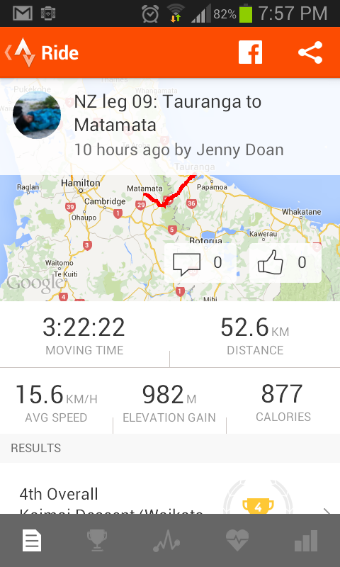 Initially, the ride didn’t look hard, given that it was the shortest leg of my trip, but it crossed the Kaimai Range (a big mountain range). I didn’t have any breaks or any photo opportunities, but the Strava screenshots tell the story.