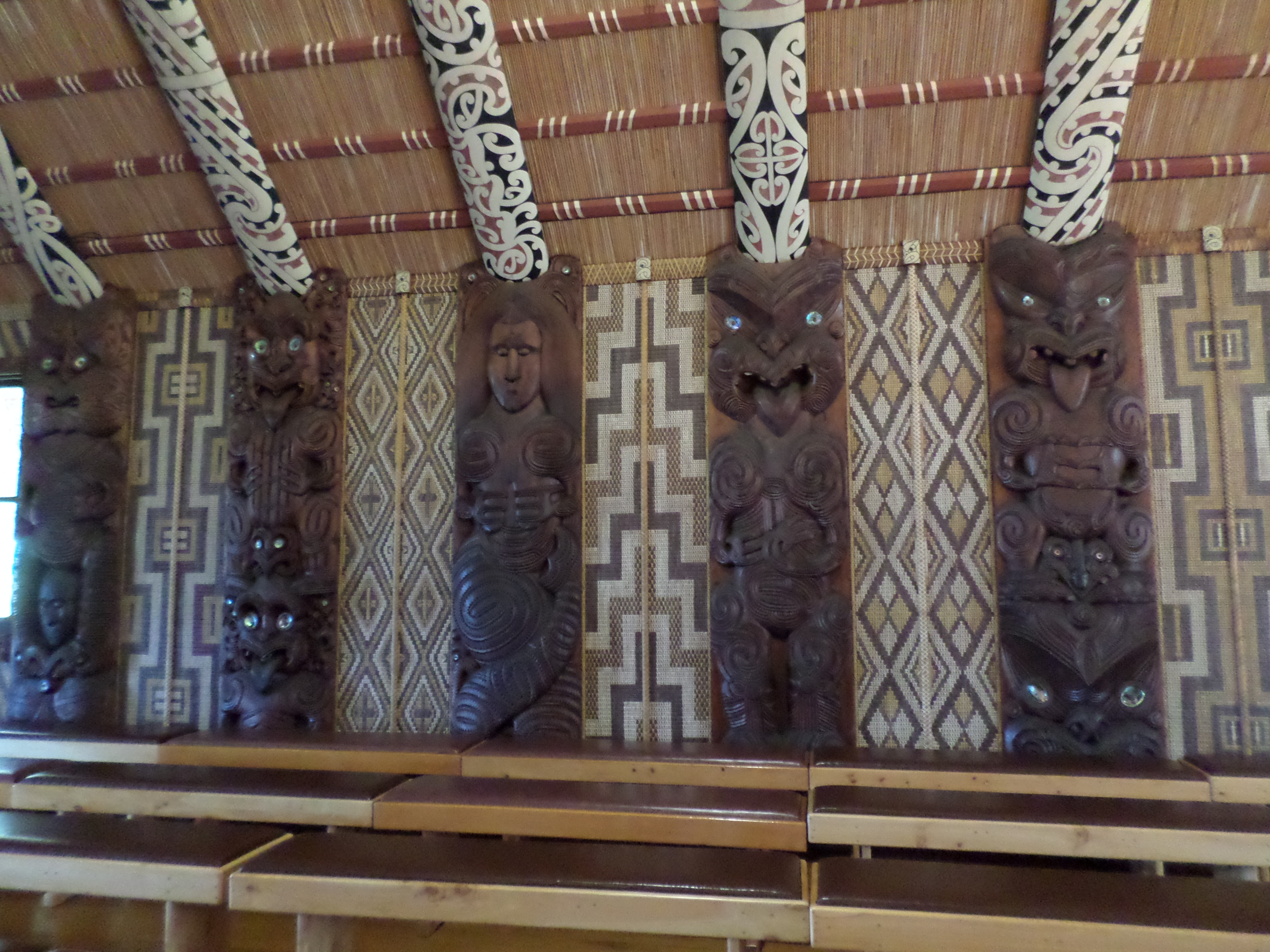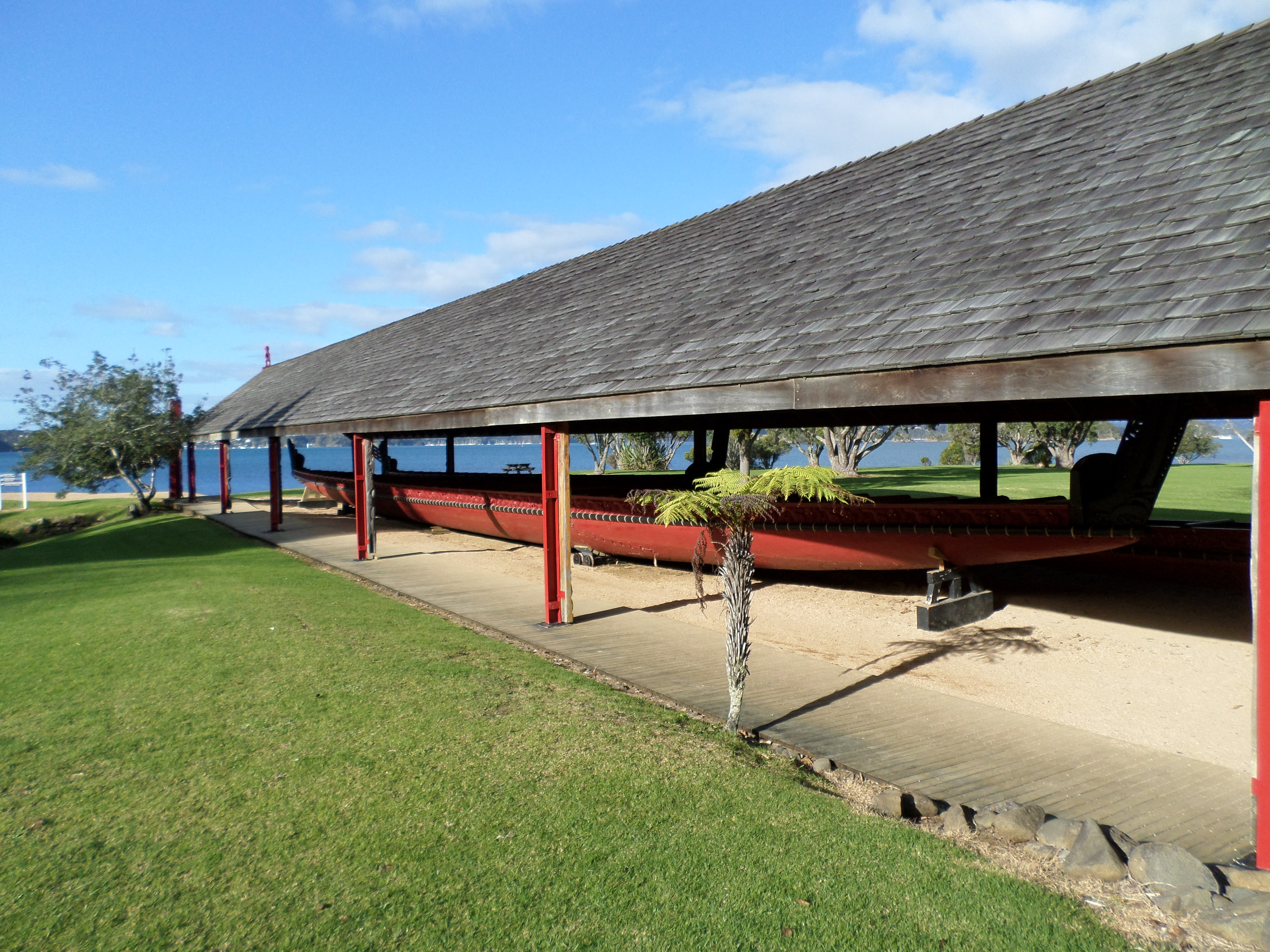 I took pictures of the walls and ceilings because I liked the carvings and I’m a fan of geometric prints and patterns. It turns out each of the carvings and woven panels mark a different ancestor for each tribe in the North Island. As I continued on through the grounds I came across the war canoes, there are three which were carved from Kauri trees. The cool thing is that they still work and they’re launched for Waitangi Day each year.