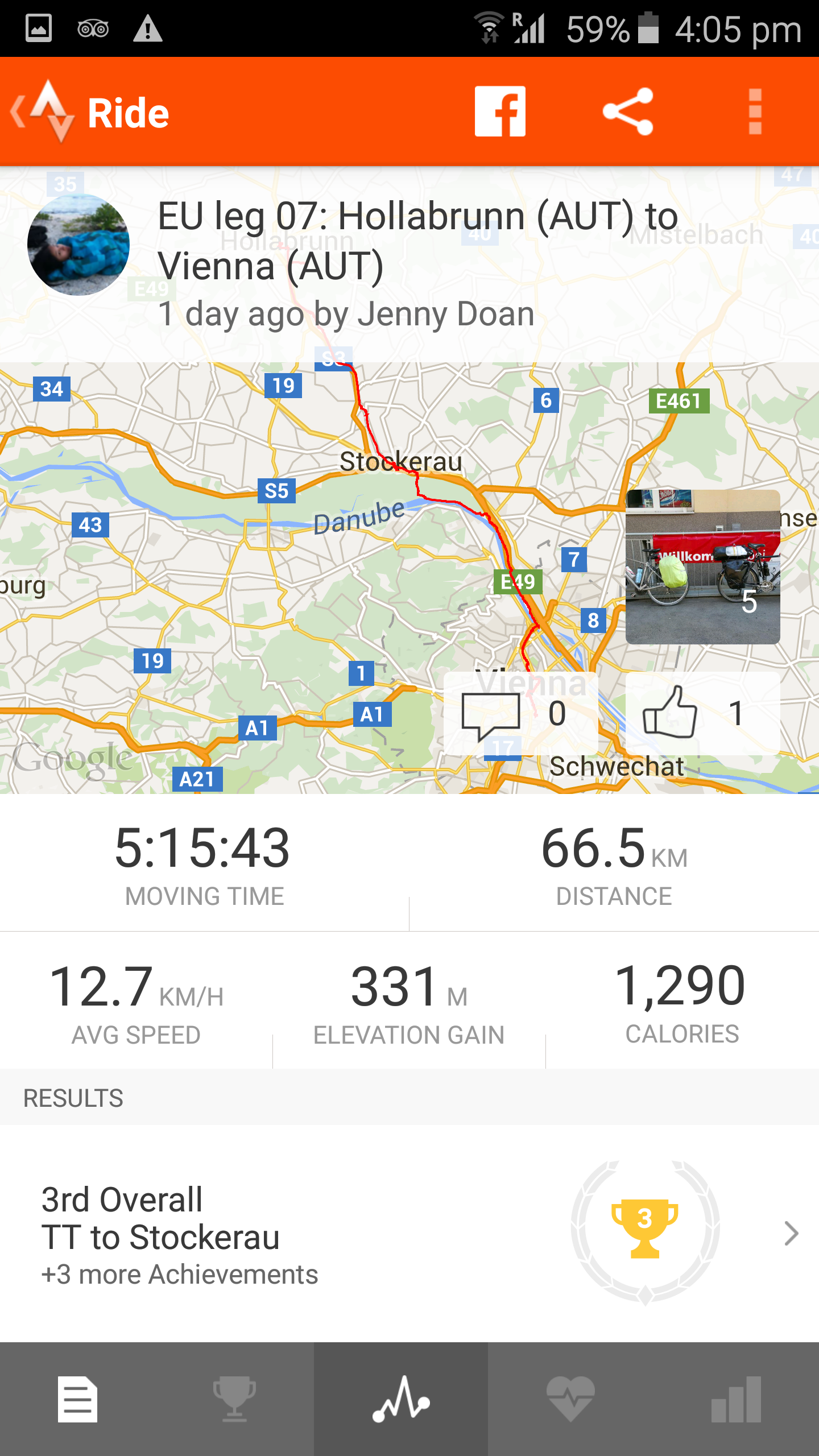 The last leg into town was guided by signposts, but once we were in central Vienna, I was feeling so hungry that I couldn’t navigate us by memory anymore. Luckily Claire had data on her phone and we could use Google Maps. We checked into the hostel and had to use a ramp to get our stuff up the stairs. I then realised that her loaded bike was significantly heavier than I imagined, I couldn’t even lift her bikes by the handlebars. I was impressed and amazed that she could get up the hills along the way, with a commendable speed too. We were both exhausted from the warm day and just had dinner while trying to rehydrate as much as possible. I really enjoyed having a friend to ride with and I was looking forward to exploring the city tomorrow too.