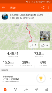 The rest of the ride was pretty straight forward, no big surprises, just a steady headwind holding me back. Getting into town in Gumi wasn’t pleasant, there was a lot of traffic and the guest house location was a bit dodgy. I got some unwelcome looks as I went out to find dinner, so I took the hint and didn’t wander very far. It’s all good though, the rest of week looks sunny and I’m getting closer to the finish line.