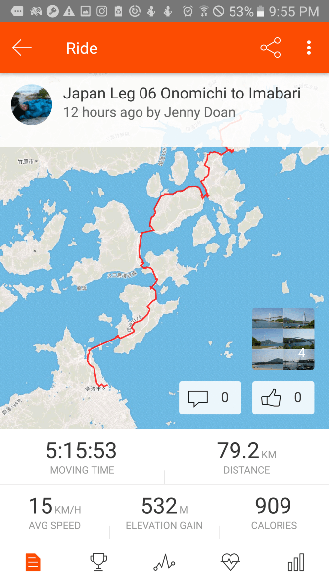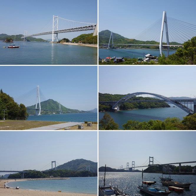 Today’s ride was awesome! The Shimanami Kaido Bridges connect seven islands and have excellent cycle paths throughout the whole course. Since it was the weekend before Golden Week (a week long public holiday in Japan), there were loads of people taking advantage of the great ride and pleasant weather. I saw road cyclists, tourers, casuals and people using the bike rentals too.
