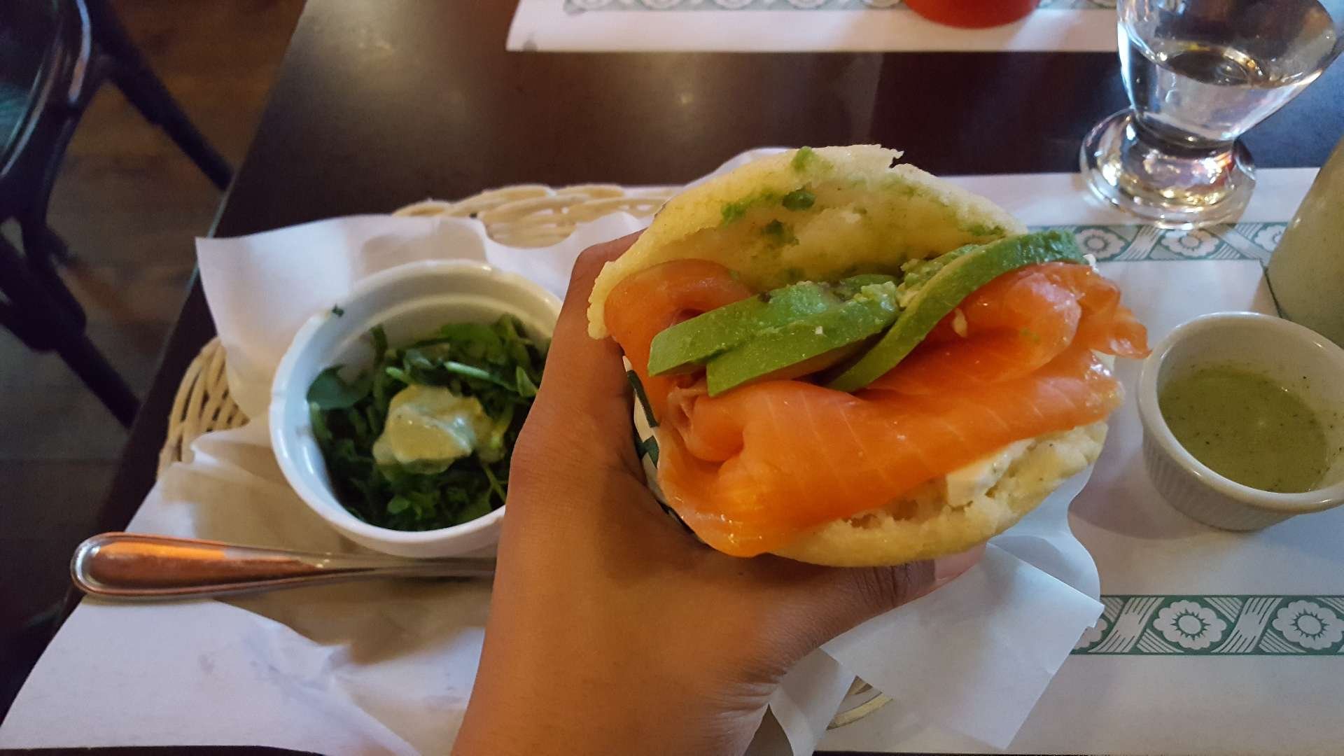 wp-image-989663093 Published 04/09/2017 at 1920 × 1080 Salmon and avocado filled arepera (Venezuelan bread made from corn) at Arepera in Montreal